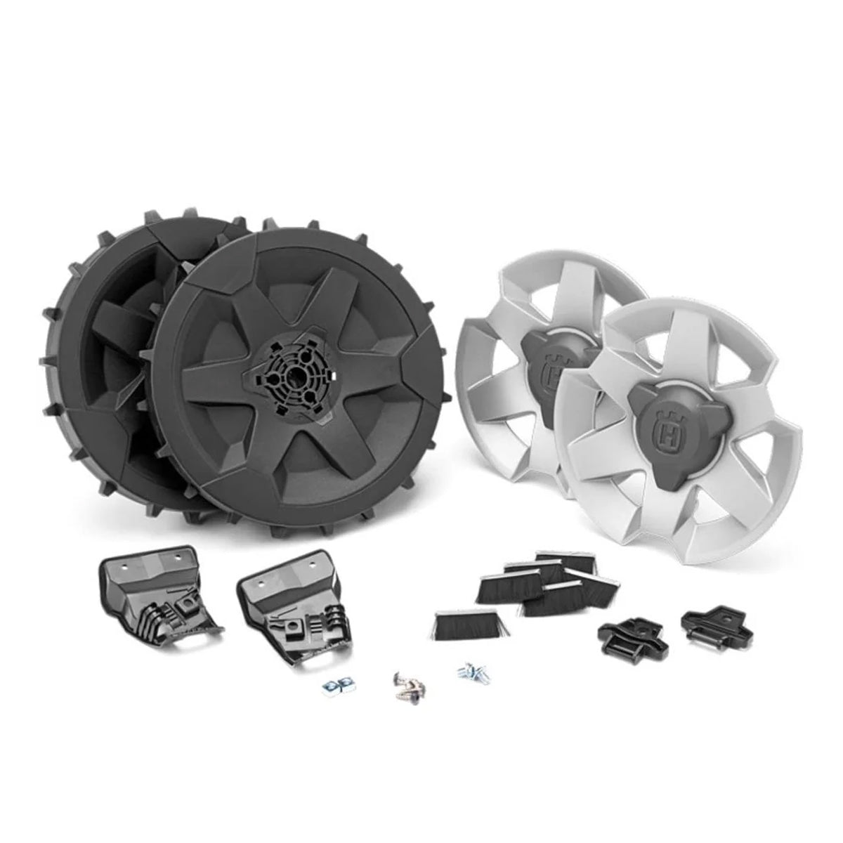 Kit containing course threaded wheels and wheel brushes for excellent traction on rough and sloping lawns.