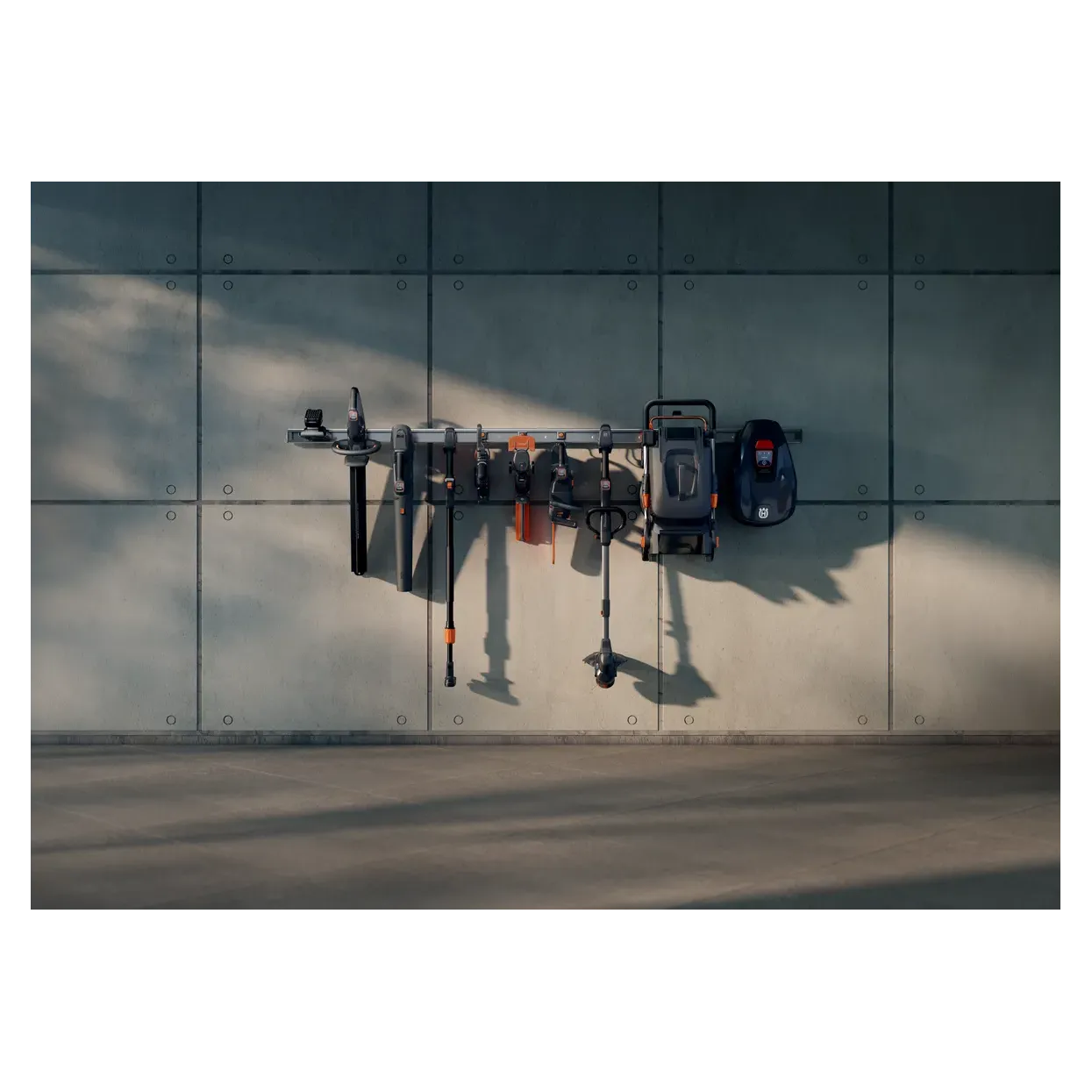 Conveniently and neatly organise your garden tools in limited space with this wall mounted storage rail. Smart, effective storage for the Husqvarna Aspire range. Each rail is 640 mm wide, so as your tool collection grows, simply extend with more rails. The 3 mm aluminium oxide ensures your storage is as premium and robust as your tools. Every Aspire product comes with a tailor-made hook to fit this wall rack. Also compatible with the Husqvarna Aspire Storage Hook kit for all your gardening tools, such as hand tools, water hose or broom. Screws, plastic plugs and end caps are included to mount the rail with a clean finished look.