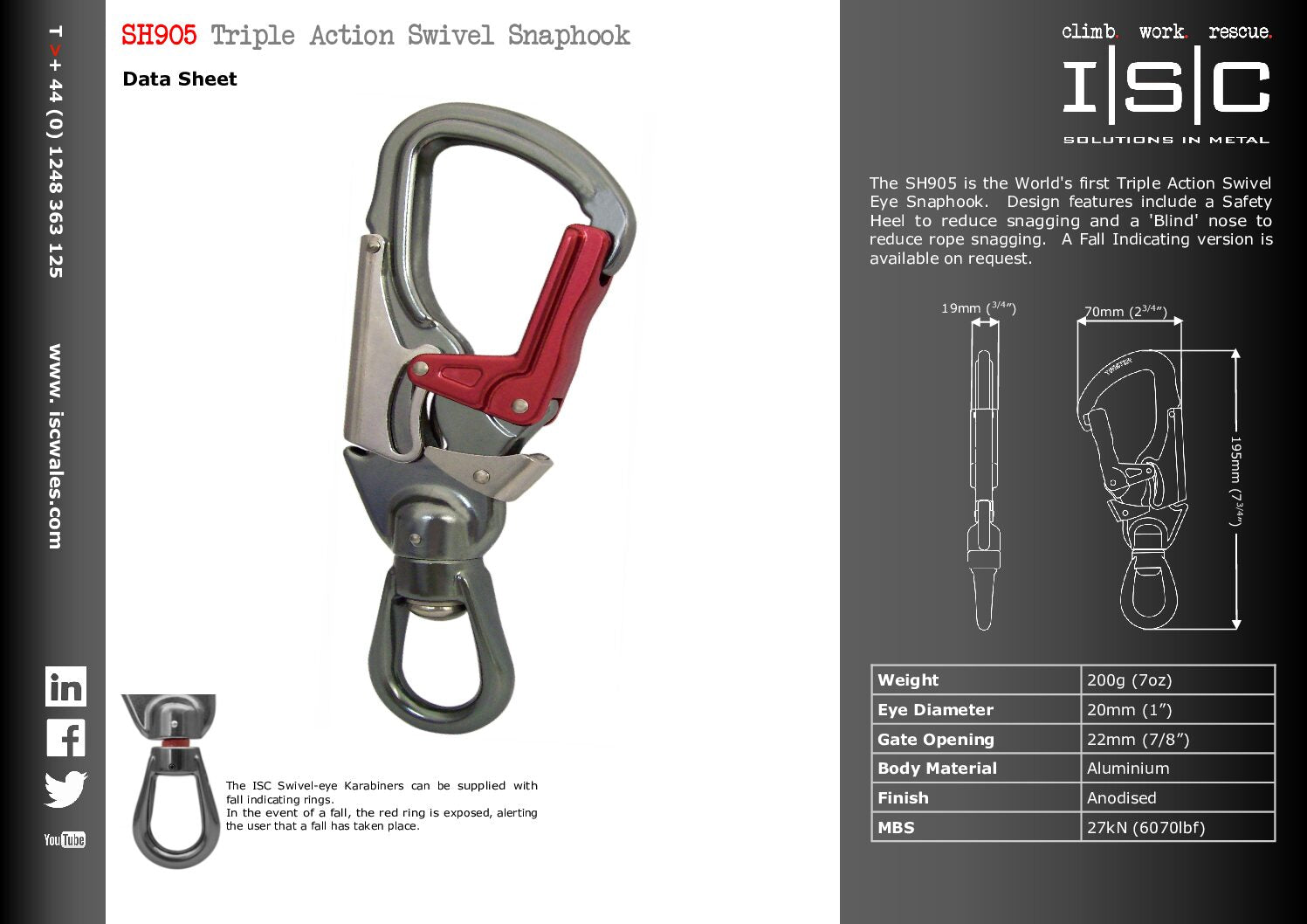 ISC Triple Action Swivel Snaphook The SH905 is the World's first Triple Action Swivel Eye Snaphook.  Design features include a Safety Heel to reduce snagging and a 'Blind' nose to reduce rope snagging.  A Fall Indicating version is available on request.