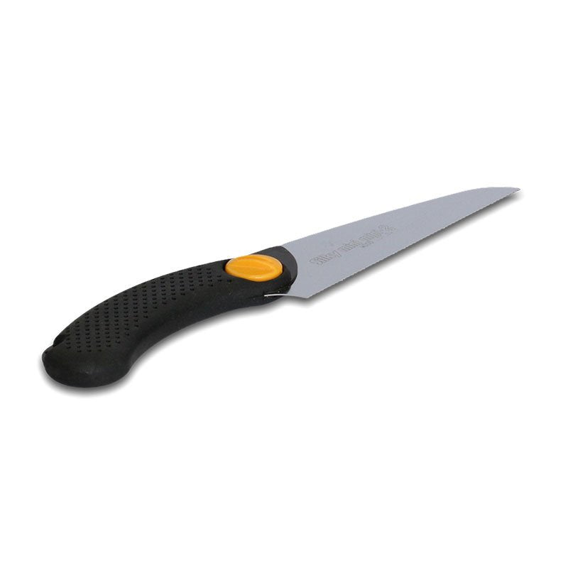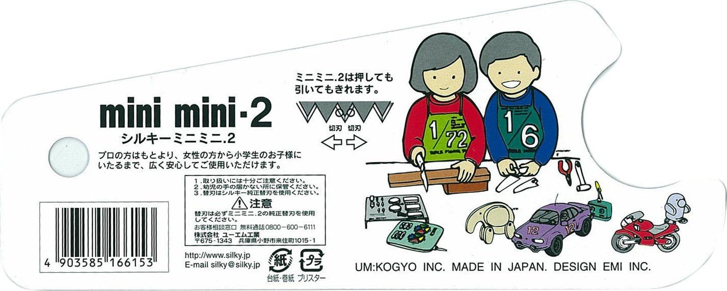 Silky Mini Mini. Small compact hand saw with 6-inch fixed blade for fine cuts in a variety of materials (thin wood, plastics, and nonferrous metals). The teeth, which cut on both pull and push strokes, have the same profile on all three MINI-MINI2 models. The wood version utilizes proprietary Silky 4-RETSUME (Four Rows of Teeth) Technology. Teeth are set in such a way that there appears to be 4 rows of them. The "wood" and plastic versions have about 20 teeth per inch, the "metal" version - about 36 teeth per inch. In a field testing, the metal version cut through the barrel of a felt-tip marker in 8 strokes and left a smooth surface behind. Non-slip rubberized handle provides a sure and comfortable grip. Great for DIY and professional model makers. Comes in a blister pack. Yellow plastic blade cover is included. Made in Japan.