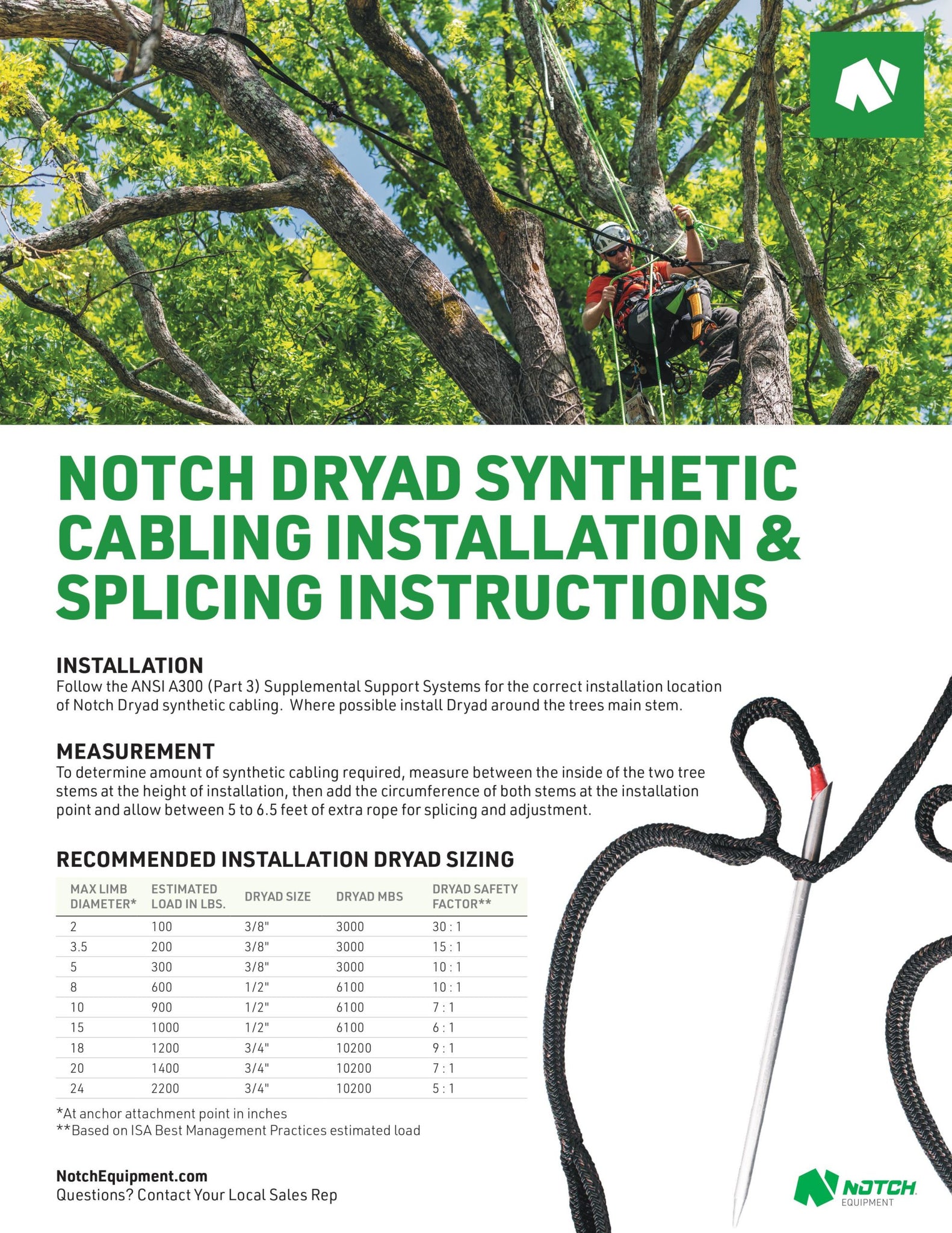 The Notch Dryad™ is a hollow braid polyester rope that serves as an alternative to steel cabling. It offers significantly lighter weight, rapid installation, and increased flexibility. This robust and durable rope, UV-resistant, is easily splicable and almost undetectable from the ground due to its exclusive camouflage coloring. Furthermore, it’s non-invasive as its setup doesn’t require tree drilling.