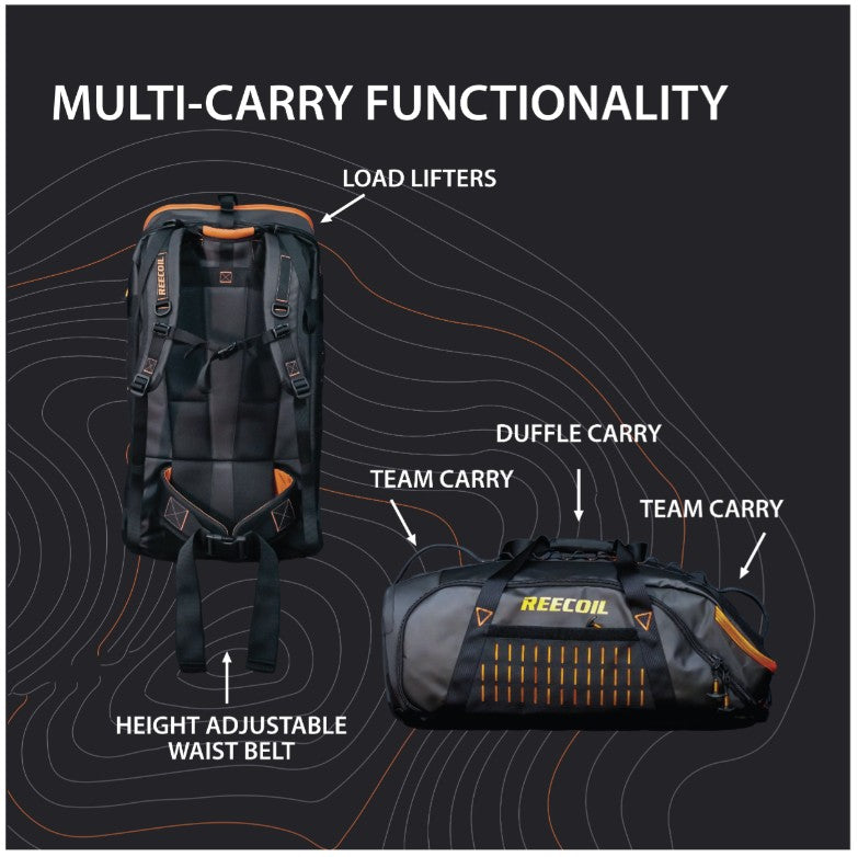 CARRY OPTIONS: Featuring a rucksack carry system including well padded shoulder straps with load lifters, and a height adjustable waist belt. Designed for hiking into location. As well as duffle carry straps for duffle bag style carrying. Plus front and back “team carry” handles to share the load with another person, or for easier maneuvering of the pack when loading in and out of vehicles.