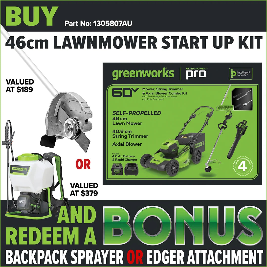 Greenworks LMC410 60V 46cm Self-Propelled Lawnmower Start Up Kit [1305807AU]