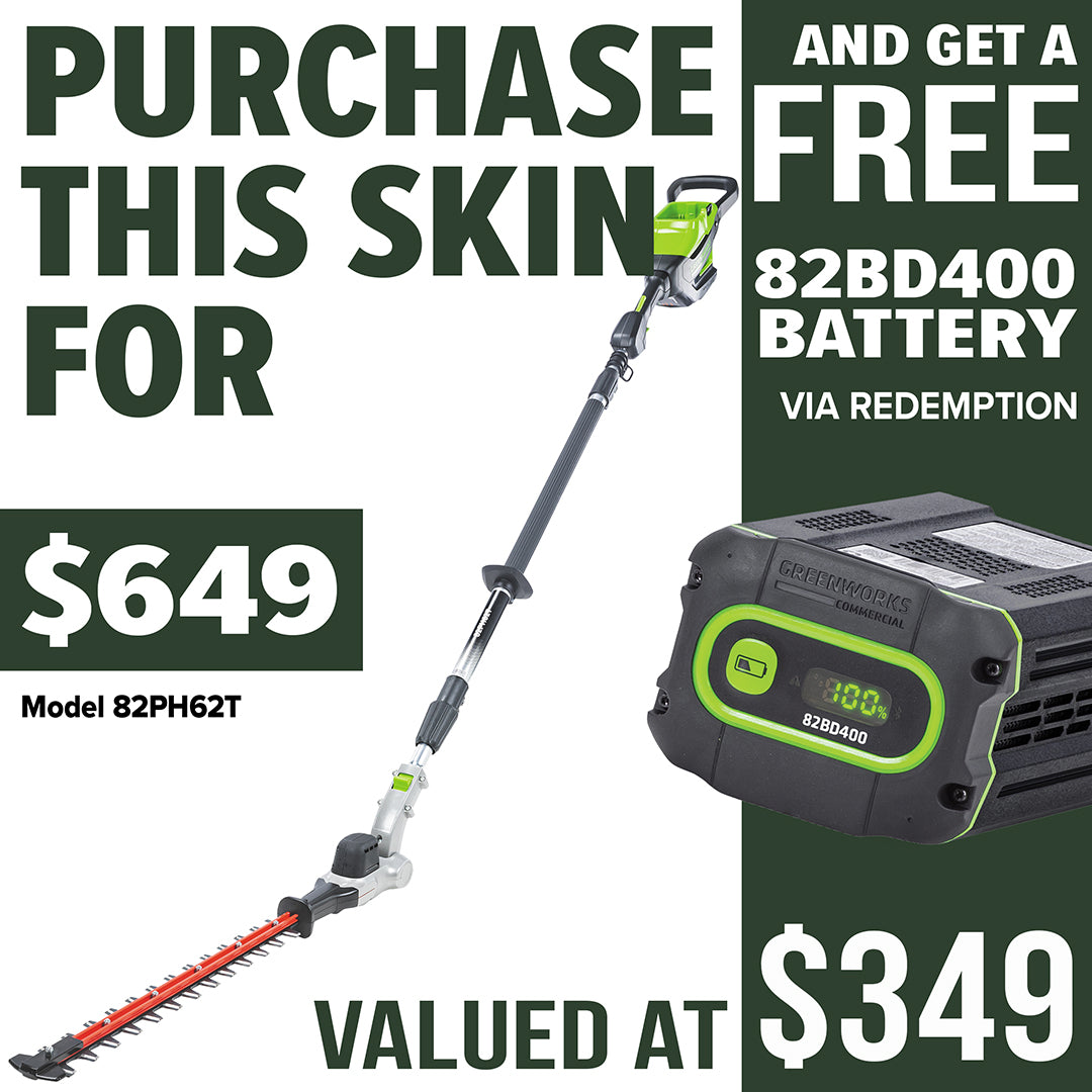This telescopic pole fixed hedge trimmer is part of the complete portfolio of commercial grade 82V zero emission landscaping equipment from GREENWORKS Commercial – the leading manufacturer of commercial battery powered landscaping equipment.