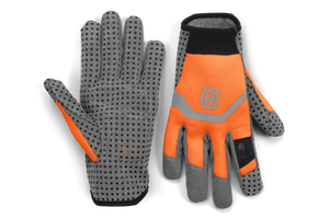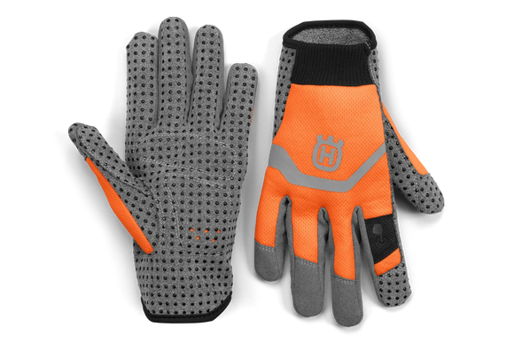 Thin, ventilated protective gloves designed for all-round gardening and forestry work in warm and dry weather. The palm of this working glove is made of breathable, quick-drying synthetic leather, which provides good grip, while your inner hand is protected by shock-absorbing padding. The index finger has a touch screen-friendly knuckle so you can use your smartphone with your gloves on. This protective glove is easy to hand-wash and stubborn dirt such as resin can be easily removed. Fulfil EN 388:2016. Size 7-10.
