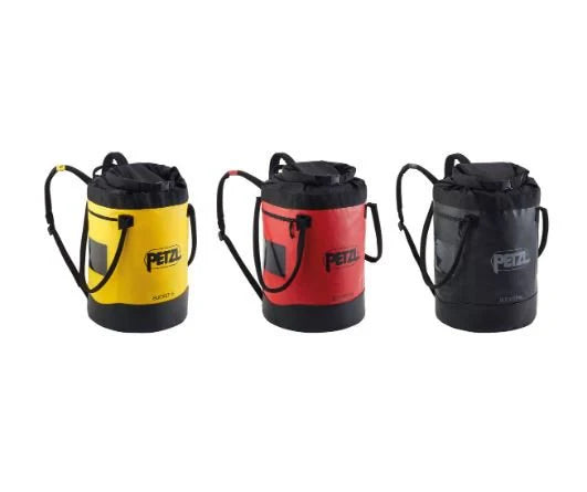 Petzl Bucket. On-site and on the go, the Petzl Bucket bag won't let you down. Made of a waterproof PU-PE fabric mix that is both durable and flexible, the simple design of the bucket bag features carrying handles with a comfortable grip, easy to adjust shoulder straps, and a coated fabric bottom for increased durability. Storing ropes and any associated gear is quick as the bag remains upright and keeps its shape even when empty, for easy access to the contents of the bag. Available in 15 liters and 30 liters, the Petzl Bucket comes in vibrant red.