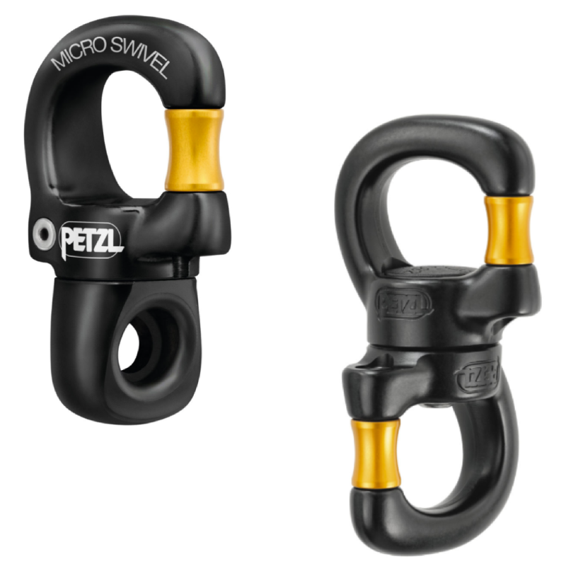 The compact, openable MICRO SWIVEL is designed for attachment to a locking carabiner. It helps prevent twisting of lanyards and allows correct positioning of devices. Its design without bearings allows it to turn freely when not loaded and to stop moving when loaded in order to maintain the devices in position.